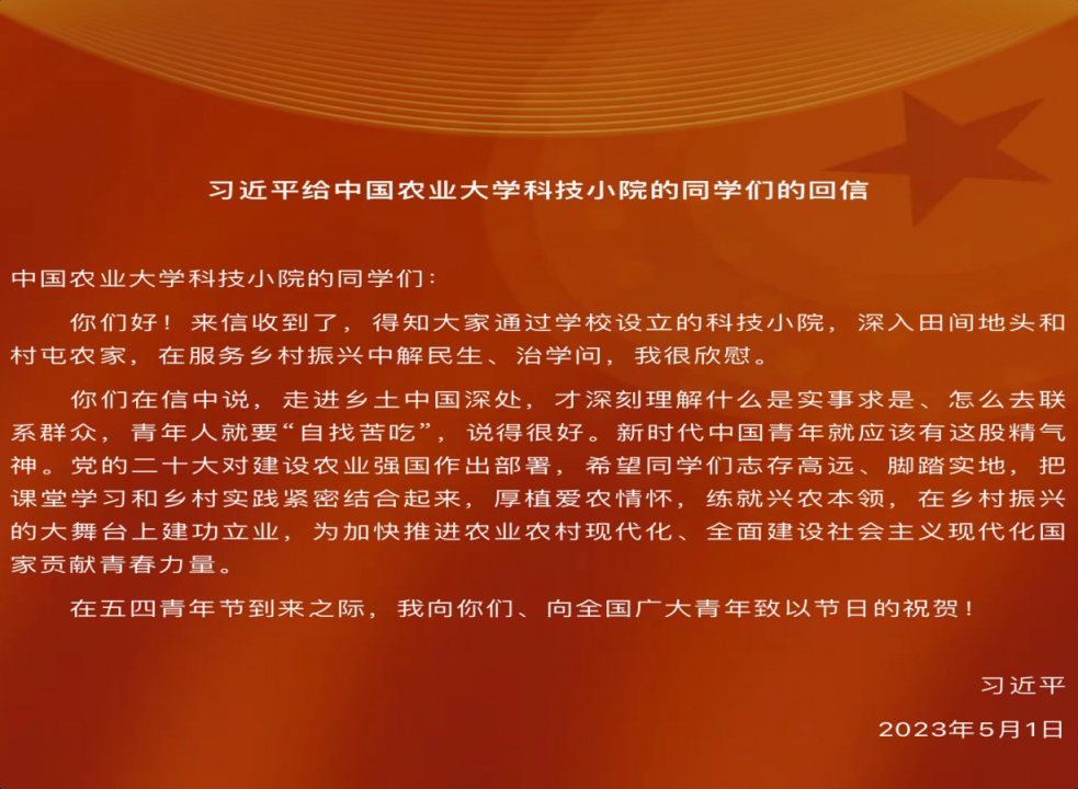 近日,习近平总书记给我校科技小院的同学们回信,提出殷切期望,并在五四青年节到来之际,向全国广大青年致以节日的问候。习主席在信中强调,希望同学们志存高远、脚踏实地,把课堂学习和乡村实践紧密结合起来,厚植爱农情怀,练就兴农本领,在乡村振兴的大舞台上建功立业,为加快推进农业农村现代化、全面建设社会主义现代化国家贡献青春力量。