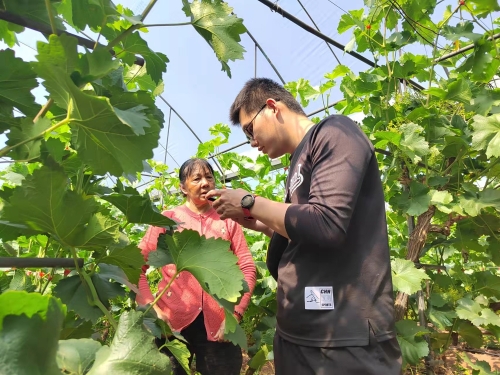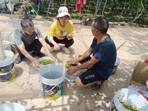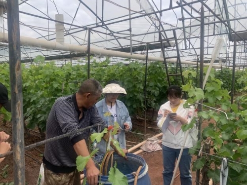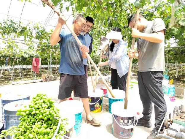 2023年4月21日至今,高游慧、徐润钰、席凯凯等同学每天都奔波在田间地头,顶着熊熊烈日调研了解当地村民生产、生活现状,熟悉当地葡萄产业种植管理技术,帮助村民们为葡萄修枝打顶、疏花疏果,利用生物发酵技术带领村民积极开展农用酵素制作,不仅将科学技术带到田间地头,而且解决了当地废弃葡萄残果等农业废弃物随意乱推乱放的污染问题。