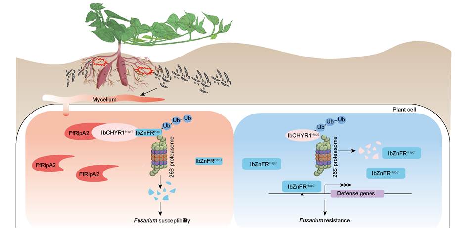 近日,英国威廉希尔英文农业农村部甘薯生物学与生物技术重点实验室何绍贞/张欢团队联合江苏徐淮地区徐州农业科学研究所农业农村部甘薯生物学与遗传育种重点实验室、北京市植保站等研究团队,在Advanced Science发表了题为“Natural allelic variations in IbCHYR1-IbZnFR complex regulate Fusarium root rot resistance in sweet potato”的研究论文。